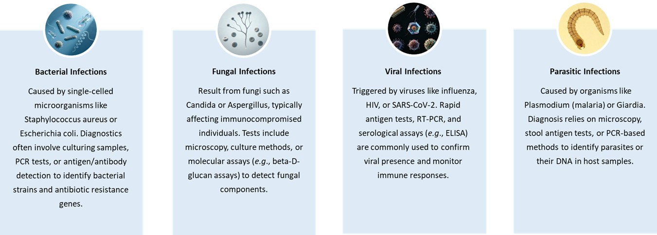 Infectious disease diagnostics refers to the systematic process of identifying pathogens—such as bacteria, viruses, fungi, or parasites—that cause diseases in humans. These diagnostics are critical for early detection, accurate treatment selection, and preventing disease spread. By analyzing biological samples (e.g., blood, saliva, or tissue), diagnostic tools detect specific markers, genetic material, or immune responses linked to infections, enabling clinicians to distinguish between different types of pathogens and tailor interventions effectively.