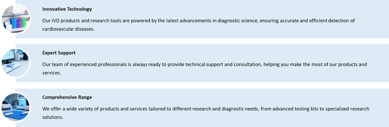Welcome to Alta DiagnoTech, your premier destination for state-of-the-art cardiovascular disease (CVD) in vitro diagnostic (IVD) products and research solutions. We are dedicated to advancing healthcare through cutting-edge technology and reliable services. Our platform offers a comprehensive range of high-quality IVD products and research tools specifically designed to meet the needs of professionals in the cardiovascular field. Here are three key advantages that set us apart: