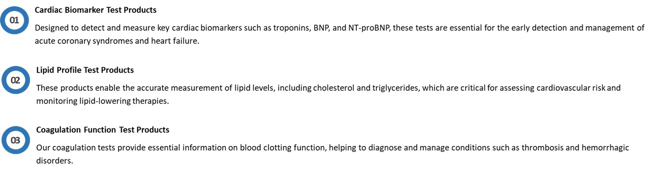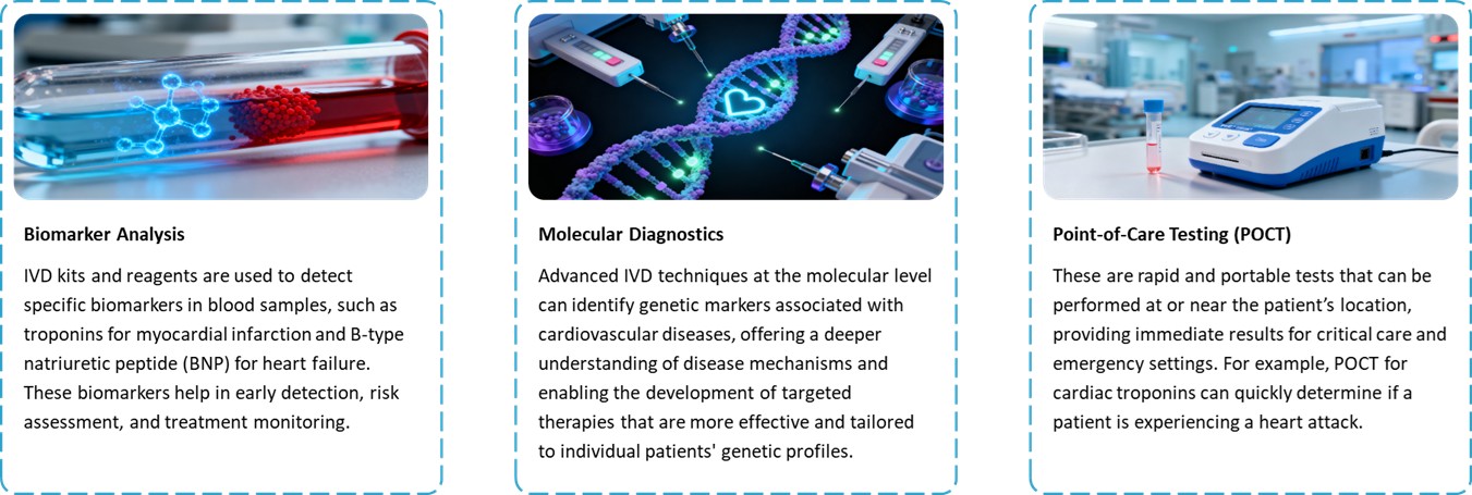 Cardiovascular diseases (CVD) encompass a range of conditions that affect the heart and blood vessels, including coronary heart disease, peripheral artery disease, and stroke. Diagnosing these conditions often involves a combination of clinical examinations and laboratory tests that utilize biomarkers to assess cardiac function and damage. In vitro diagnostic (IVD) tests play a crucial role in this process by analyzing biomarkers in body fluids to provide accurate and efficient detection of cardiovascular diseases.