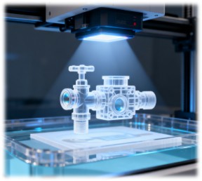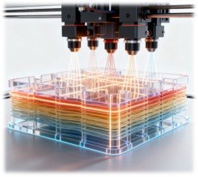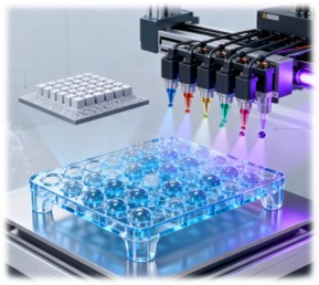 Vat polymerization-based printing relies on light-curing resin materials and selective hardening through polymerization. This technique is widely used for creating complex devices with functional parts such as valves, lenses, and fluidic interconnects. Digital light processing (DLP) and stereolithography (SLA) are common processes that use light to selectively cure the resin, resulting in high-resolution and detailed parts. Multiphoton polymerization (MPP) further enhances precision by using a femtosecond laser to cure the resin in multiple directions, allowing for the creation of highly complex structures without layer-by-layer fabrication.