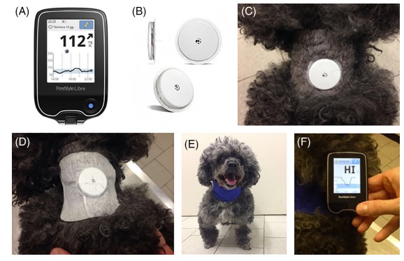 Fig.1 FreeStyle Libre is composed of the reader (A) and the sensor (B), which is placed on the dorsal part of the neck of the dog (C), secured by an additional tape (D) and a bandage applied around the neck (E). The sensor has to be scanned by the reader, which instantaneously shows the interstitial glucose value (F). The reader shows "HI" and "LO" when the interstitial glucose concentration is ≥500 mg/dL and ≤20 mg/dL, respectively. (Malerba E., et al., 2020)