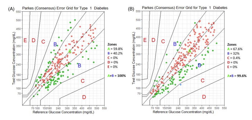 Fig.2 Parkes consensus error grid analysis (EGA) representation with the percentage of values within different zones before diabetic ketoacidosis (DKA) resolution (A) and after DKA resolution (B). (Malerba E., et al., 2020)