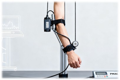 The experimental setup involved analyzing the relationship between the motor's and rotary encoder's positions. The motor, with a high accuracy of 2000 pulses per second, and the rotary encoder were connected to a PMAC controller. The experimenter wore the device, and the elbow joint's movement was tested ten times. The motor rotated at a constant speed of 3 rad/s, driving the elbow joint's movement. The upper arm was kept perpendicular to the ground, and the forearm moved under the device's force.